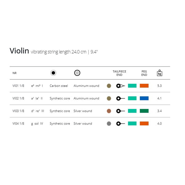1/8 Vision(ヴィジョン) は、バイオリン分数弦の中でも人気の高いシンセティックコア弦(A,D,G)です。E線ボールが外せるようになっており、ボールエンド・ループエンドどちらも使用出来ます。ヴィジョンの張力は少し高めですが押さえやすく、クリアで力強い音色と、チューニングの安定性や耐久性が良いといった特徴があります。価格設定が低めでコストパフォーマンスが良いので、お薦めの1/8サイズのバイオリン弦です。